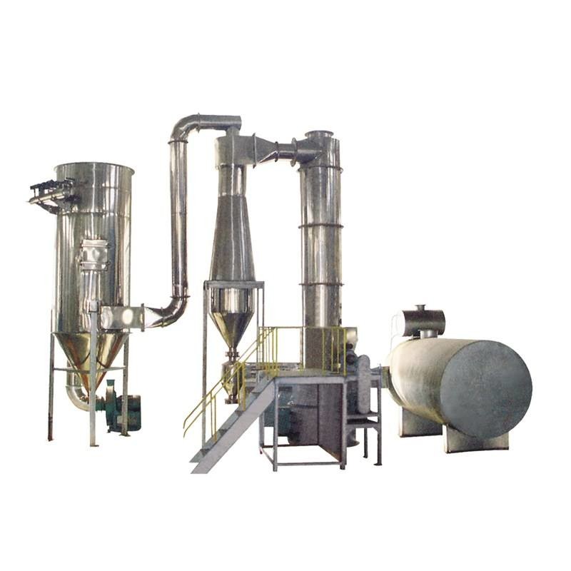 O material entra na torre de secagem diretamente através do alimentador de parafuso, e sob o impacto e a condução do fluxo de ar de alta velocidade, rapidamente dispersa-se e gerencie-se com o fluxo de ar em uma alta velocidade. Para partículas relativamente grandes e úmidas, o fluxo de ar de alta velocidade não é bastante a quebrar e girar na alta velocidade, assim que cai gradualmente sob a ação da gravidade. Quando cai à parte inferior da máquina principal, o dispositivo de esmagamento colocado na parte inferior está forçado para quebrar e micronize, e então com o fluxo de ar de alta velocidade. O processo da rotação é repetido para terminar o processo de secagem.